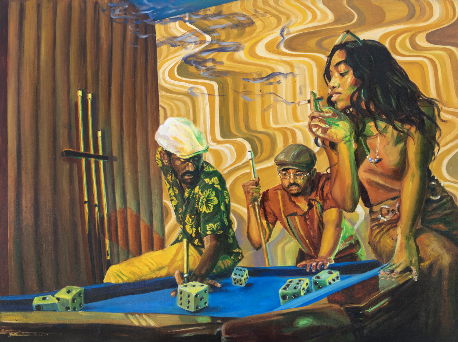 She began creating without a fixed message, dressing friends in era-defining clothing, pulling from film, music, and color psychology, and leaning into the escapist nature of cinematography. For Raven, this shift was freeing. Growing up, most representations of Black painters she encountered were rooted in cultural heritage or social commentary. While important, that framework felt limiting. This moment gave her the freedom to paint whatever she wanted.
